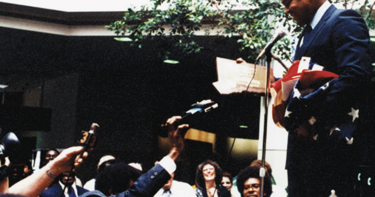 We walked Ali up the stairs to a center stage accompanied by the Mayor where Ali made some remarks to the crowd. As the audience gathered around, I spontaneously asked some of them if they would like to take part in an award ceremony for Ali. Each was eager to participate. A construction worker with a yellow hard hat stepped forward, followed by a young Black boy, a Hartford policeman and a young man who appeared to be from India. All held on to a portion of a large American flag that we had folded up to present to the Champ. Ali was very pleased with this gesture on the part of the people of Hartford and this was perhaps one of the most revered and special gifts Ali had ever received in his travels, he later confided. There was a smile of appreciation on his face and a glimmer in his eye. Later, a woman who had been standing in the crowd in the rotunda remarked to me that there was something special in the Champ’s eyes that revealed a kindhearted and godly spirit. “After all, the eyes are the windows of the soul,” she said.