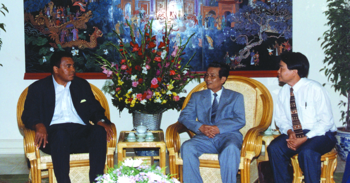 About this time, the skies darkened and a clap of thunder could be heard. The air was already hot and humid and a downpour began. We all ran for shelter. After the rain stopped, we were taken to the ornate Government Palace nearby where we met the Deputy Prime Minister, Tran Duc Luong, who was waiting for us. We were then welcomed and formally introduced. Since Ali was tired from a long, hot day and since the Deputy Prime Minister spoke no English our translator, Bill Bell, interpreted my opening remarks on behalf of Ali and our group. We were seated in a finely decorated rectangular room with high ceilings. Ali and the Deputy Prime Minister sat at the head of the room next to each other with a small coffee table between. Two attractive Vietnamese women served us tea. Speaking for Ali, I explained our mission on behalf of America’s POW/MIAs and asked the Deputy Prime Minister for the help of the Vietnamese government on this issue. I explained that we had come to build a bridge of friendship between our two nations. Ali then presented Tran Duc Luong with a copy of a prayer that was made into a song entitled “Bridge of Friendship,” written by Sharon Licht of Holland, Pennsylvania. Deputy Prime Minister Luong, the second highest-ranking Vietnamese official, indicated he would be pleased if Ali would autograph his copy of this song. As Ali autographed it, I read the words out loud. Mr. Thuy translated the lyrics for the Deputy Prime Minister who said he thought they were beautiful and inspirational.